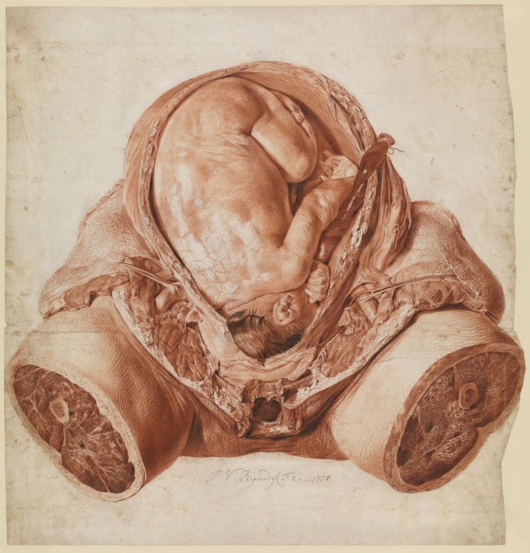 Jan van Rymsdyk (Dutch, d. 1790), Drawing for plate 6 in William Hunter, The Anatomy of the Human Gravid Uterus, exhibited in figures (Birmingham, 1774) 1750. Red chalk and touches of black on paper, 48.2 x 46.7 cm. Inscribed: ‘J. V. Rymsdyk Fec. 1750’. Sp. Coll. Hunterian Az.1.4. University of Glasgow Library, Archives and Special Collections
